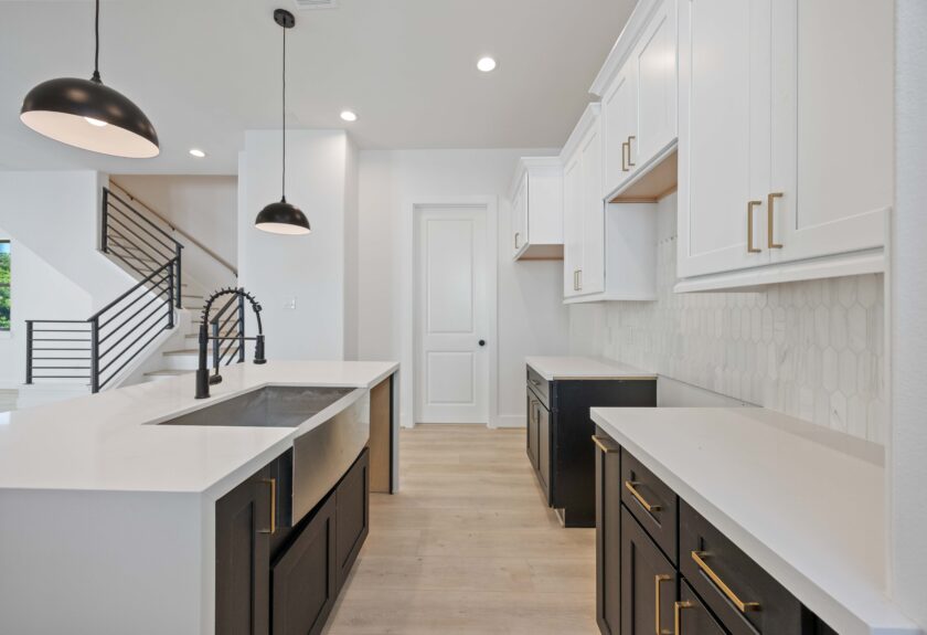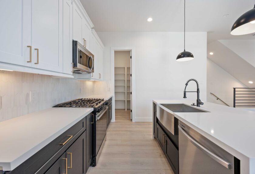 Modern kitchen with stainless steel appliances, quartz countertops, and ample cabinetry.